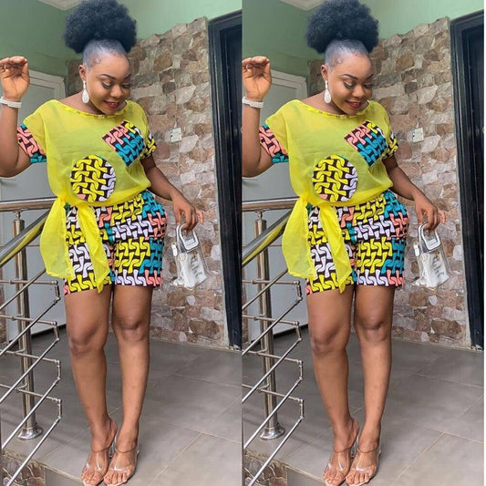 Chiffon Splicing Irregular T-Shirt with Print Shorts Set