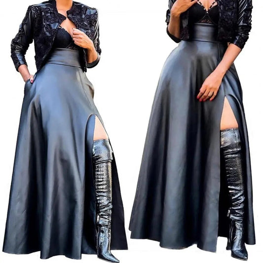 Elegant High Slit Faux Leather Stylish Long Maxi Skirt