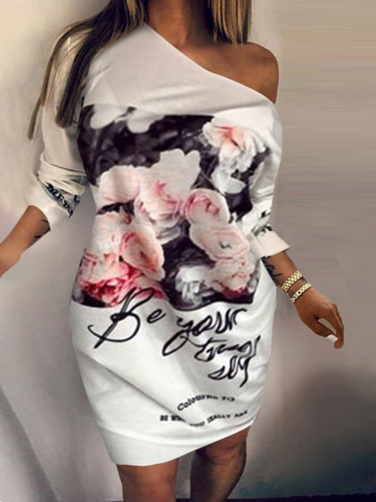 Plus Size Butterfly Fruit/Letter Print Casual One Shoulder Dress