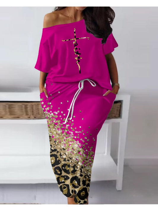 Plus Size Faith Baroque Leopard Print Casual Skew Neck Top & Drawstring Skirt Set