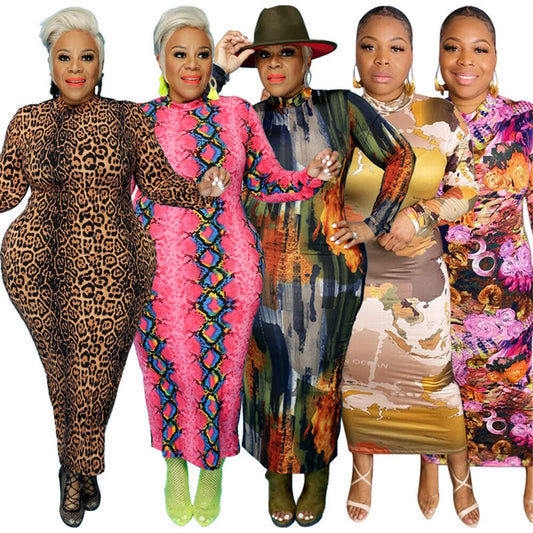 Plus Size Vintage Turtleneck Long Sleeve Print Multi Color Maxi Dress