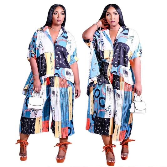 Plus Size 2 Piece Print Short Sleeve Pleated Pant Suit