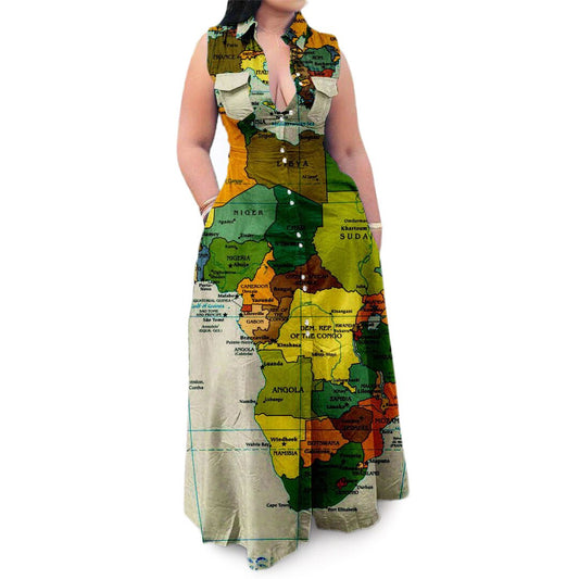 Plus Size Casual Map Printing Sleeveless Maxi Dress Women