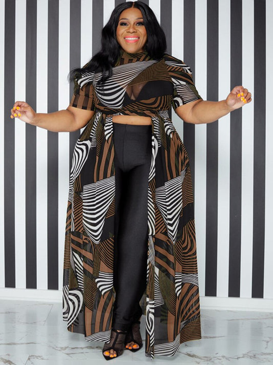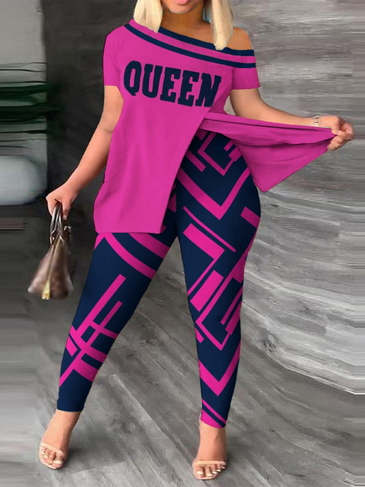 Plus Size Two Piece Print One Shoulder Split Hem Outfit