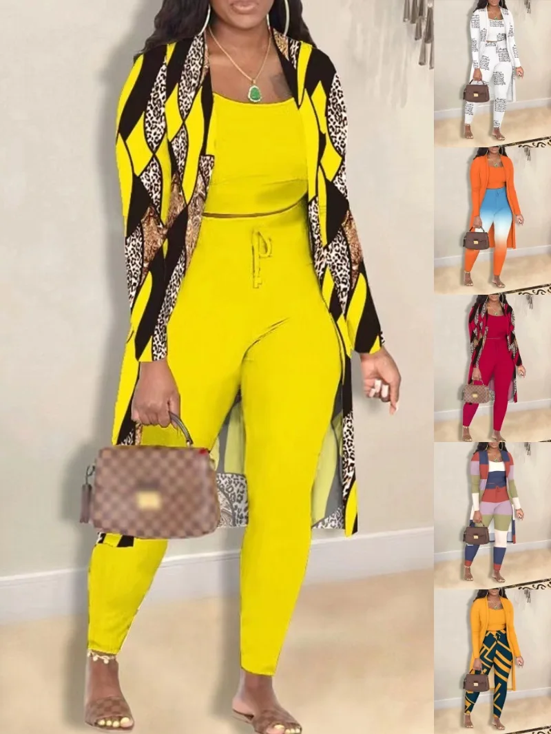 Sexy Autumn Tank Top Long Cloak Pants Casual Three Piece Set