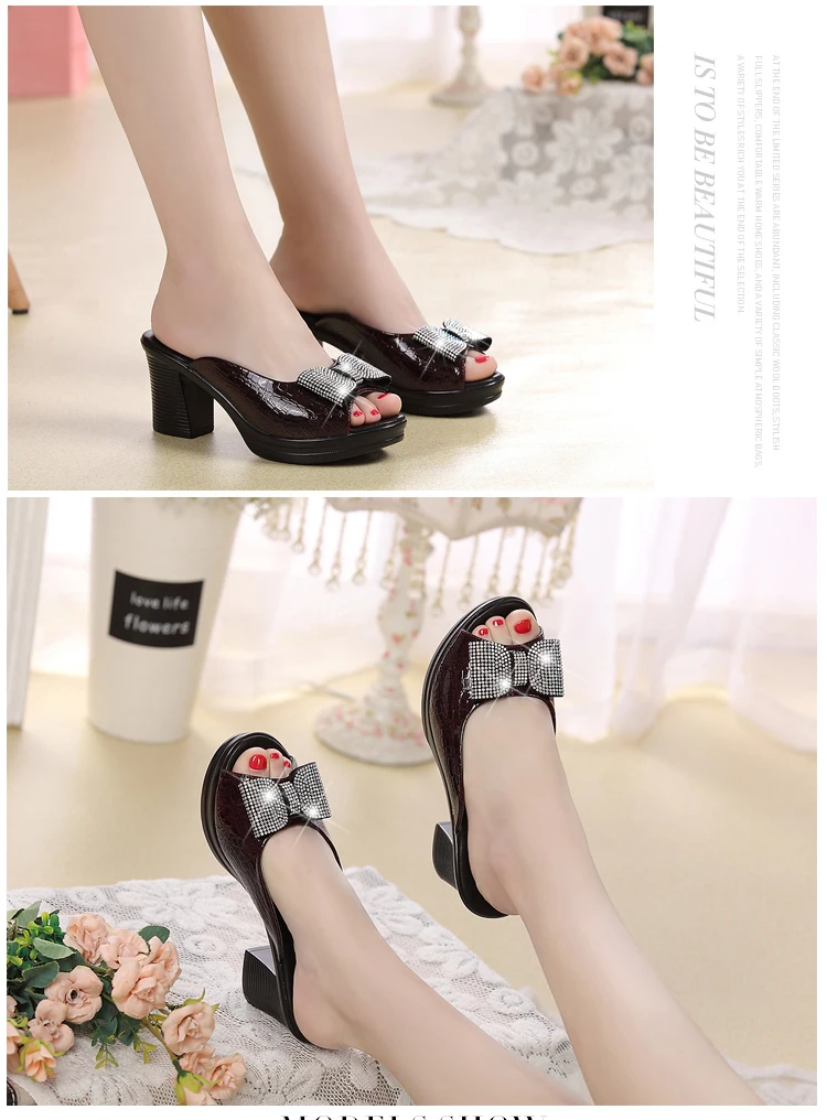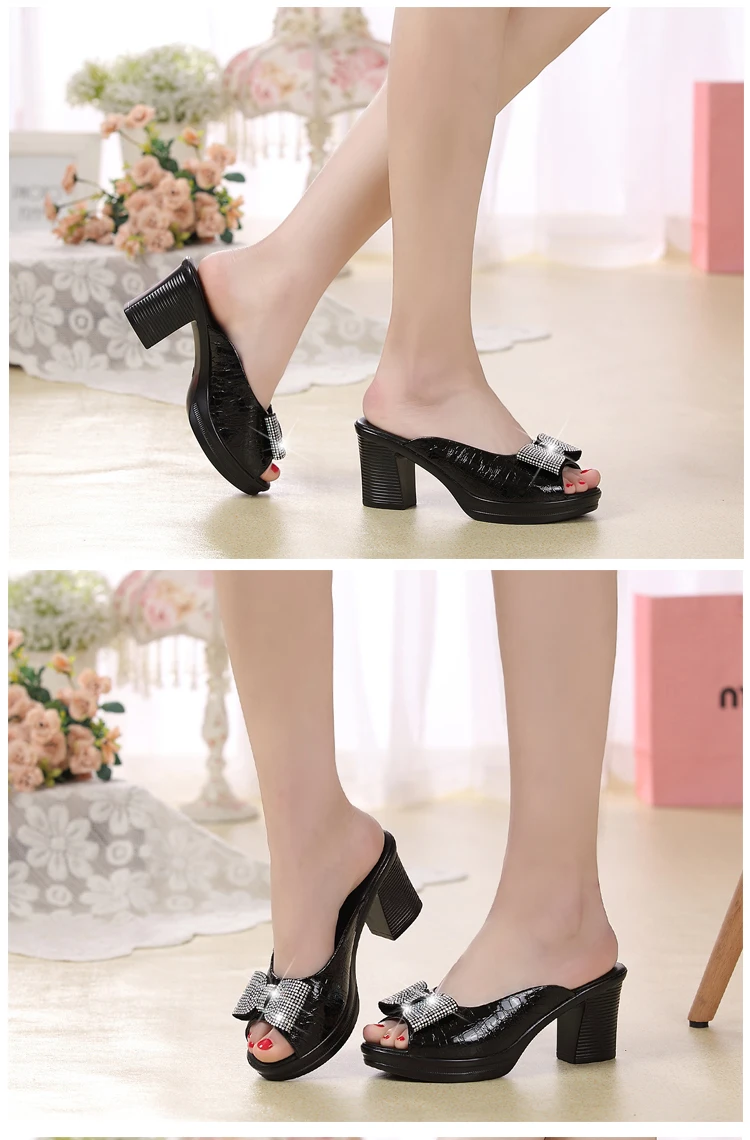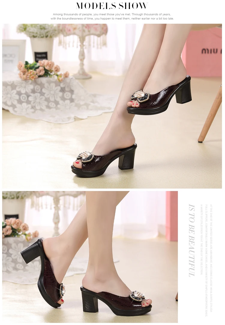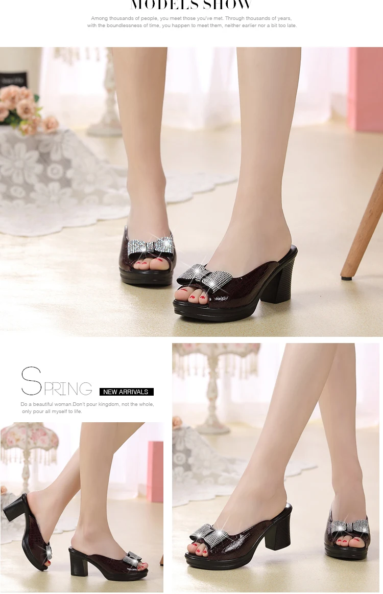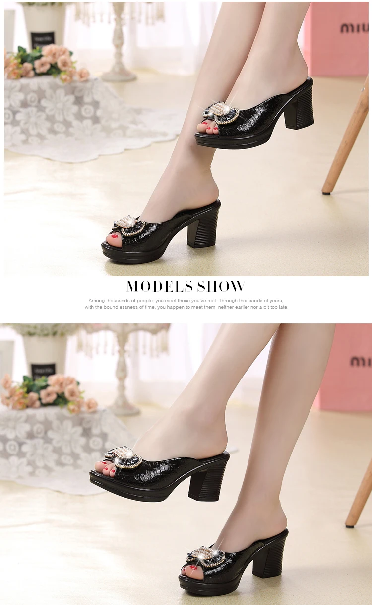 Leather Rhinestone Thick High-Heeled Color Block Open Toe Heels