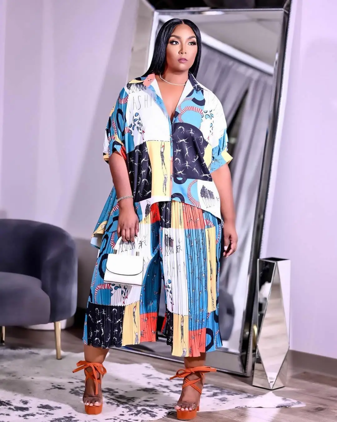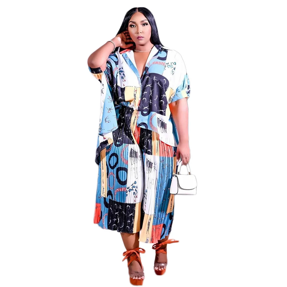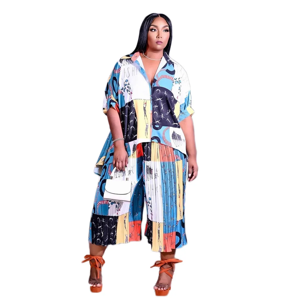 Plus Size 2 Piece Print Short Sleeve Pleated Pant Suit