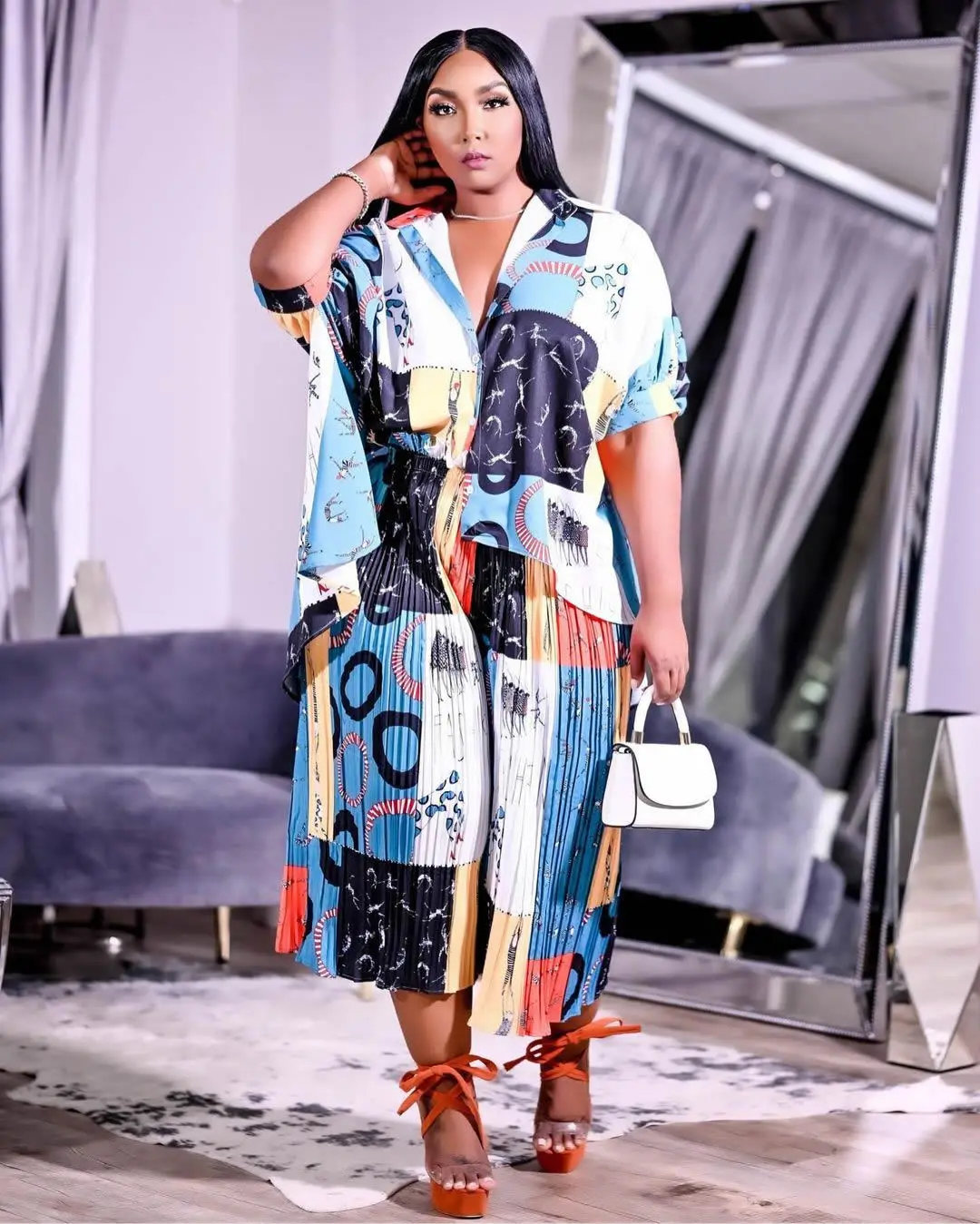 This Plus Size 2 Piece Print Short Sleeve Pleated Pant Suit is perfect for making a statement. Featuring a stylishly pleated pant and a short-sleeved top, this suit will ensure you look your best. The fabric is soft and breathable for added comfort, and its plus size silhouette provides a flattering fit.