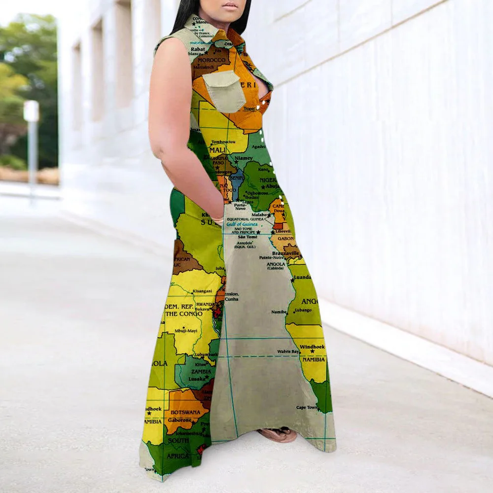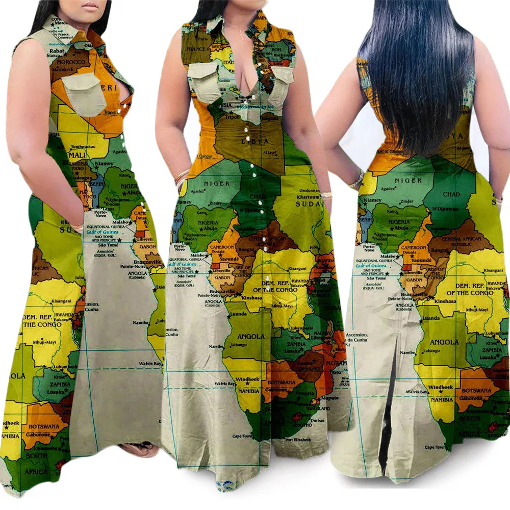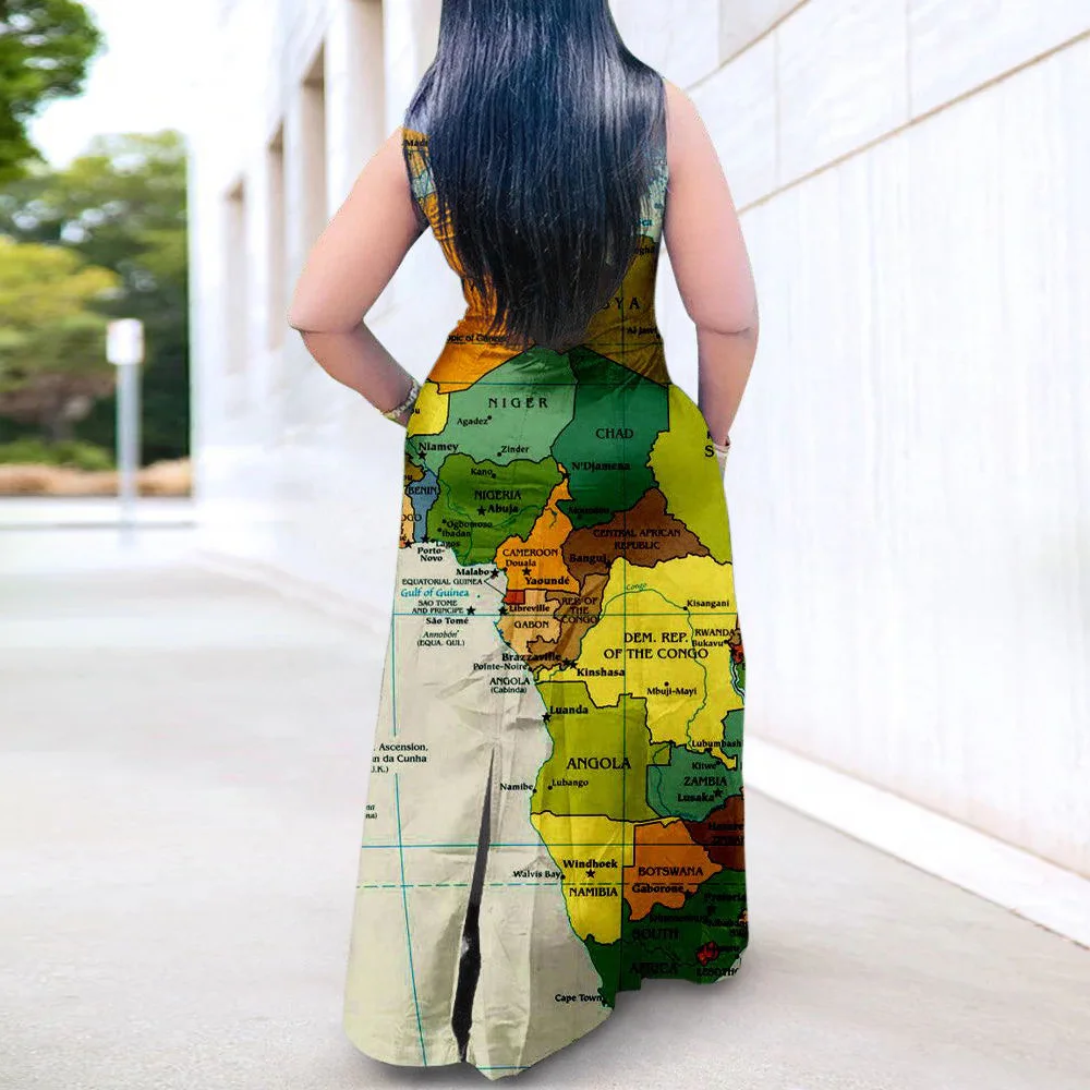 Plus Size Casual Map Printing Sleeveless Maxi Dress Women
