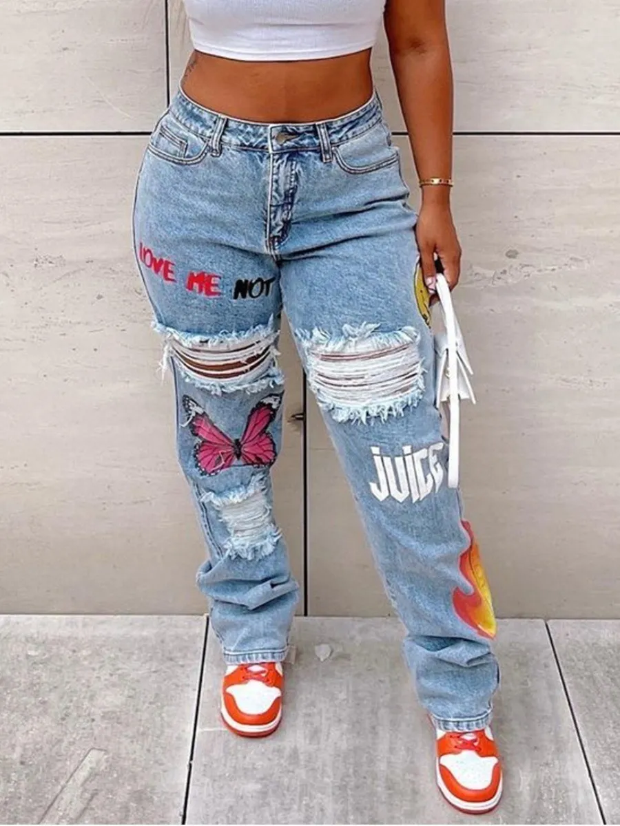 Butterfly Letter Print Ripped Jeans