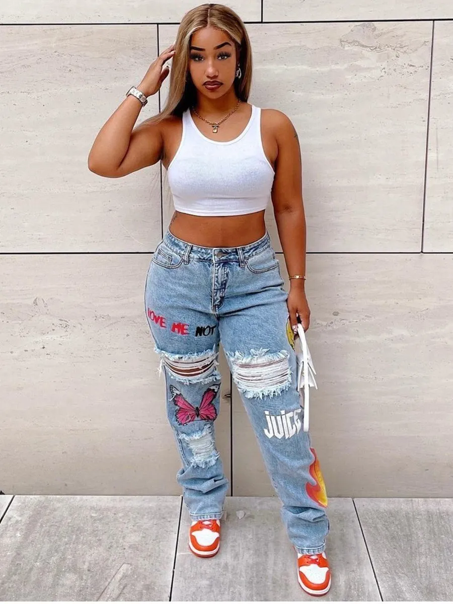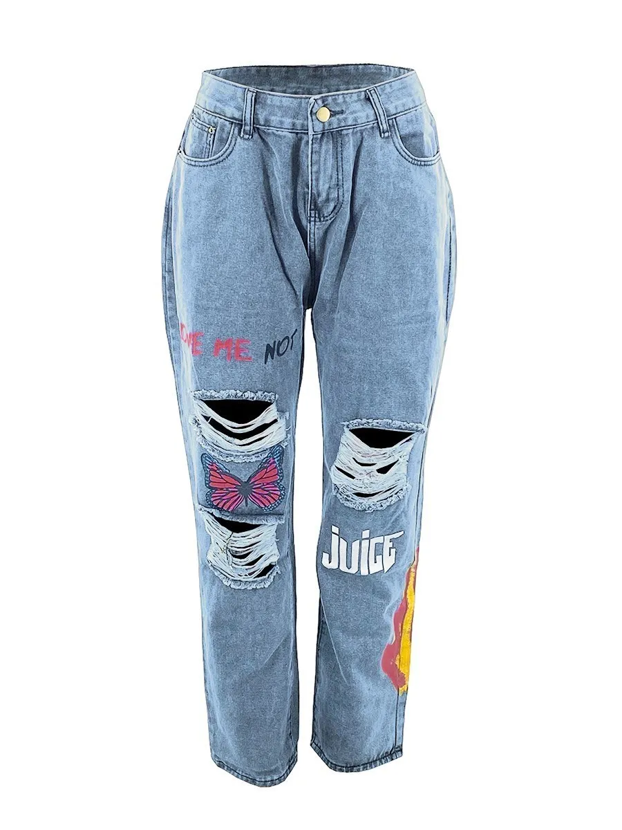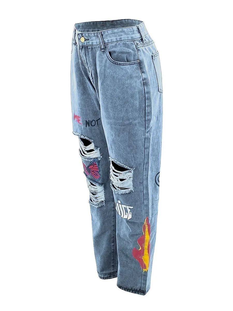 Introducing our Butterfly Letter Print Ripped Jeans, for the true fashion connoisseur. These jeans feature intricate letter prints and stylish rip accents that give off an air of luxury and sophistication. Crafted from fine materials, you won't find a more elegant take on the denims trend.