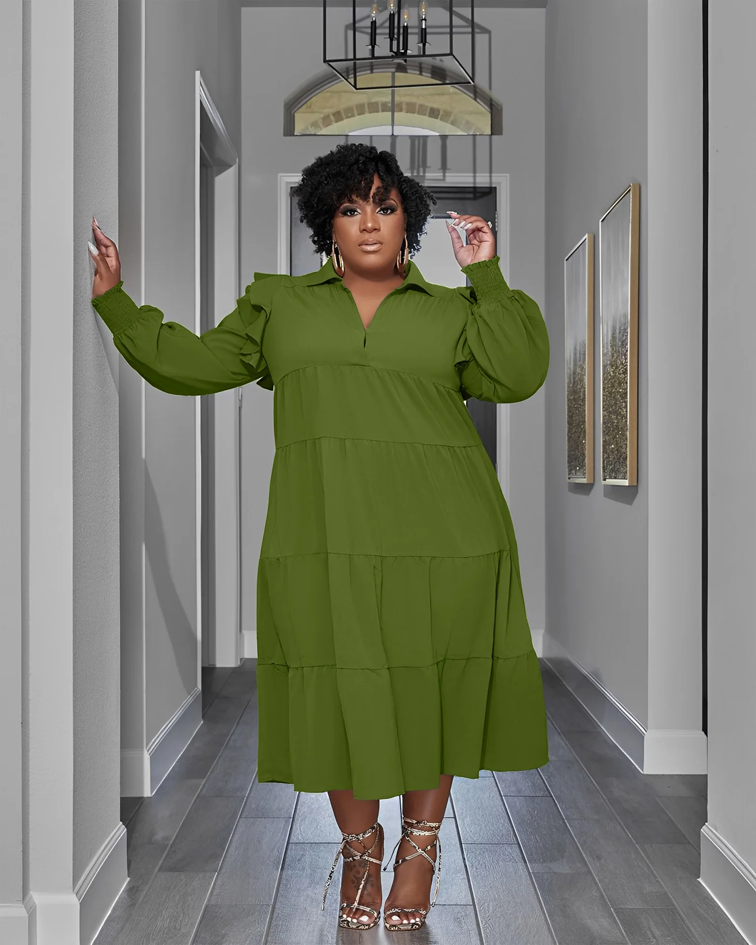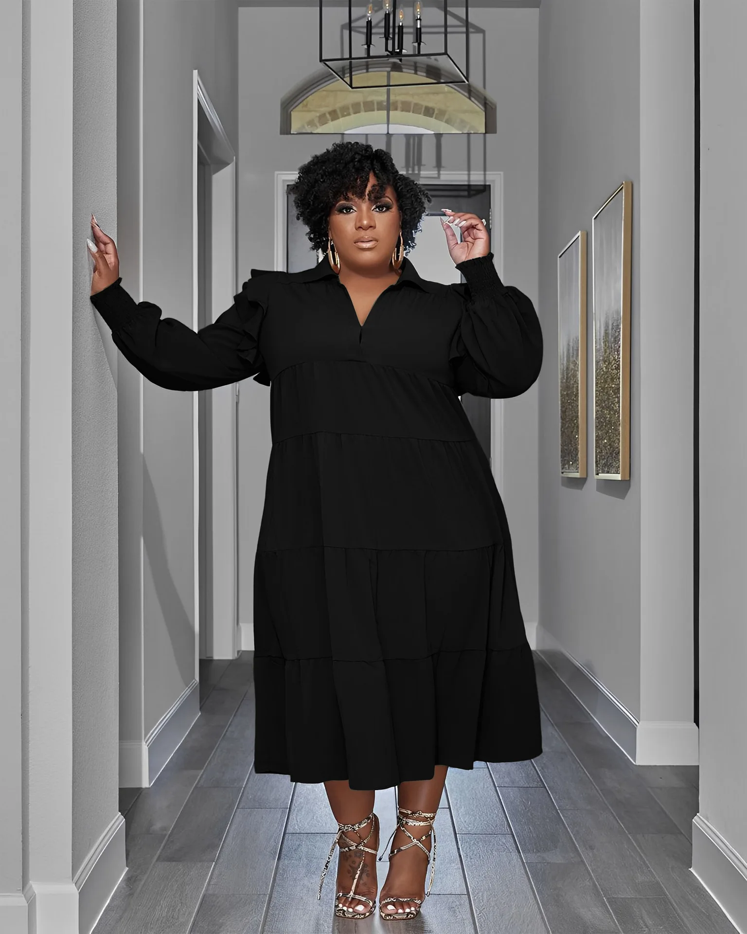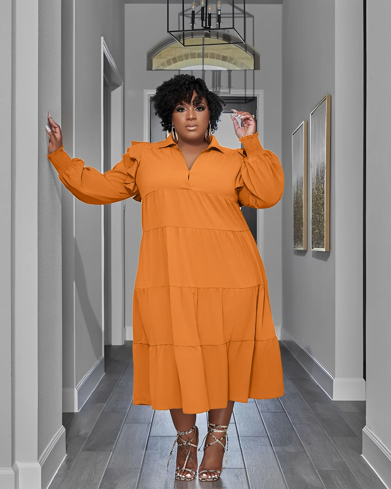 Plus Size Autumn Midi Patchwork Pleated Dress