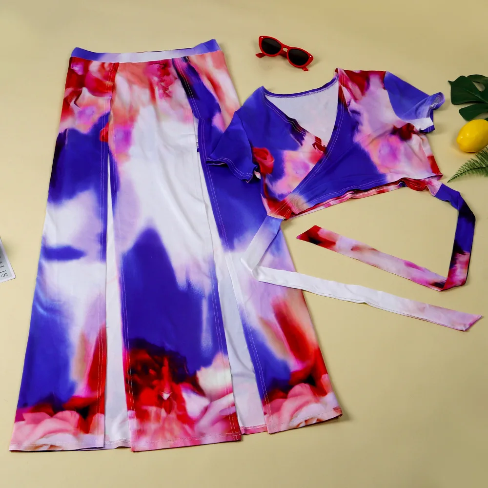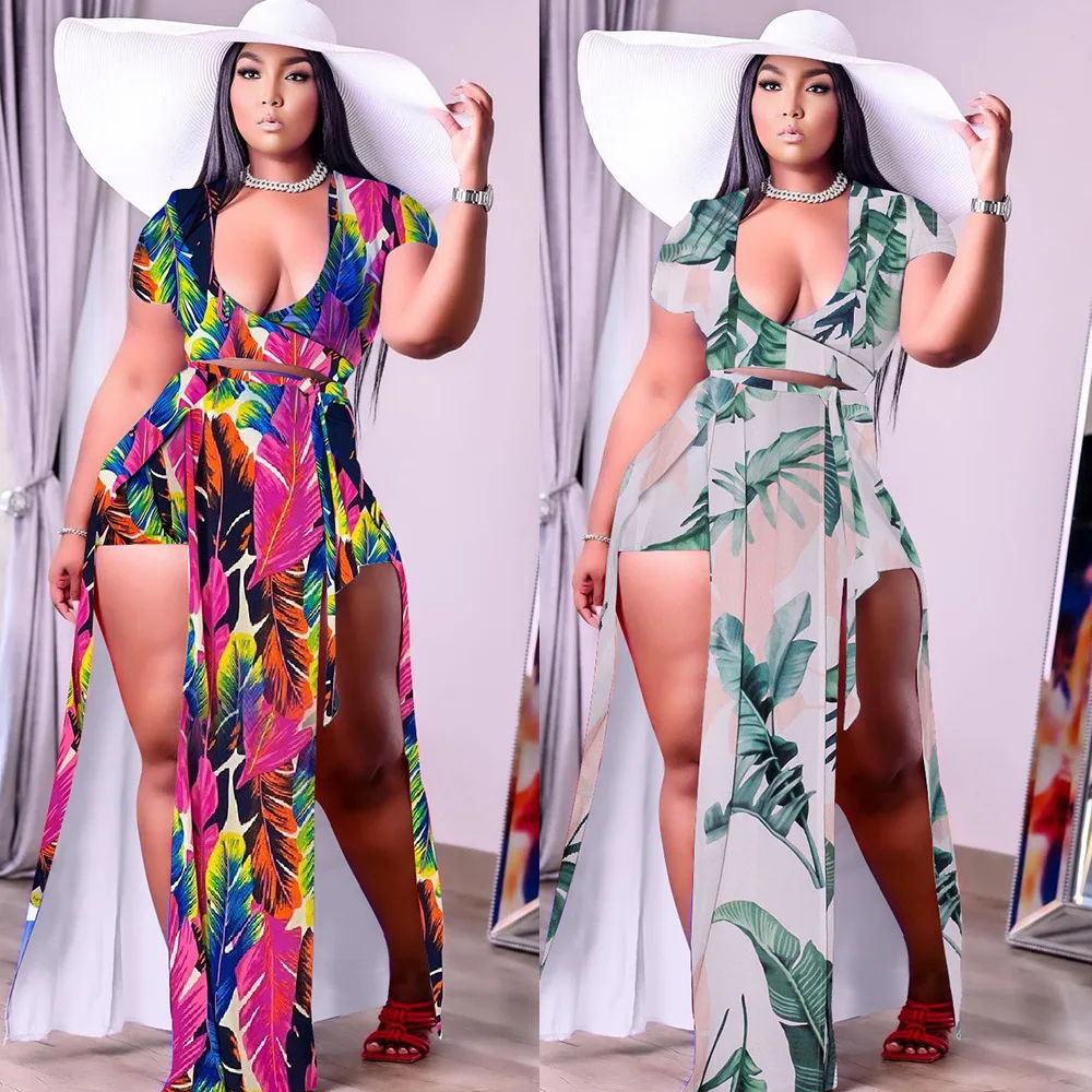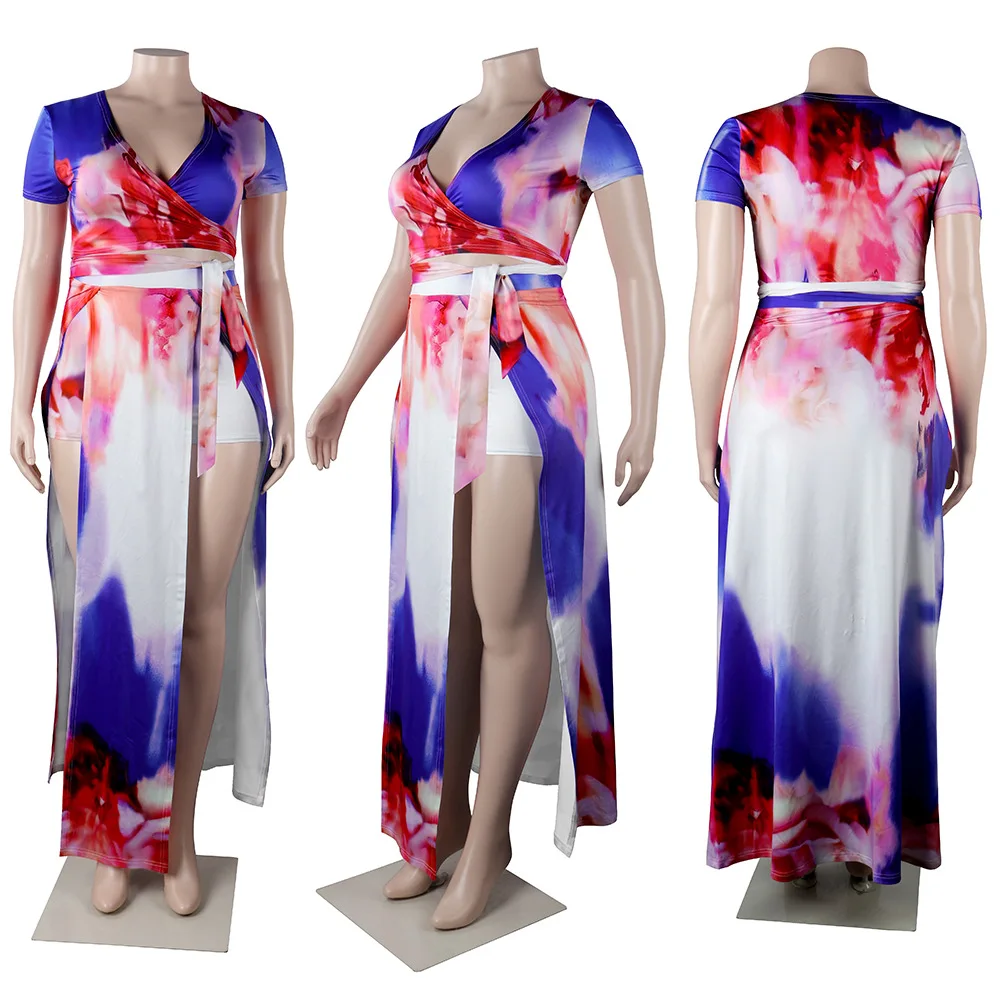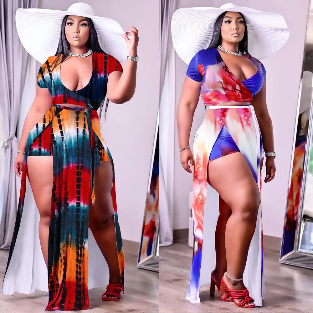 Plus Size Sexy V Collar Split Fork Rope Casual Two Piece Skirt Suit