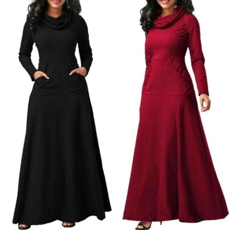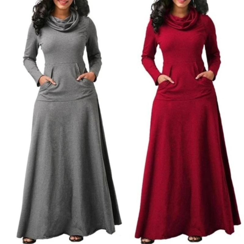 Women Warm Dress With Pocket Casual Solid Vintage Autumn Winter Maxi Dress Robe Bow Neck Long Elegant Dress