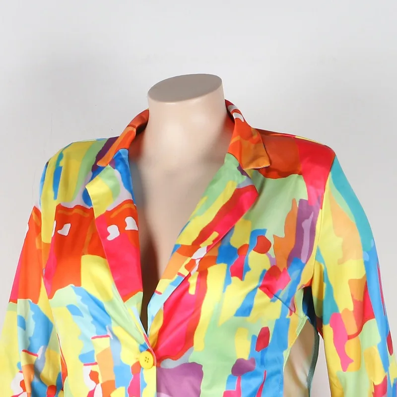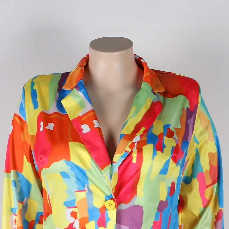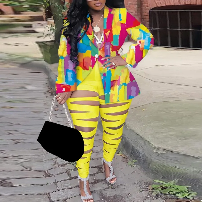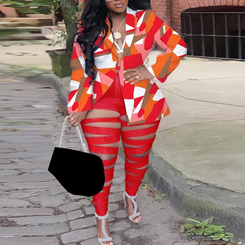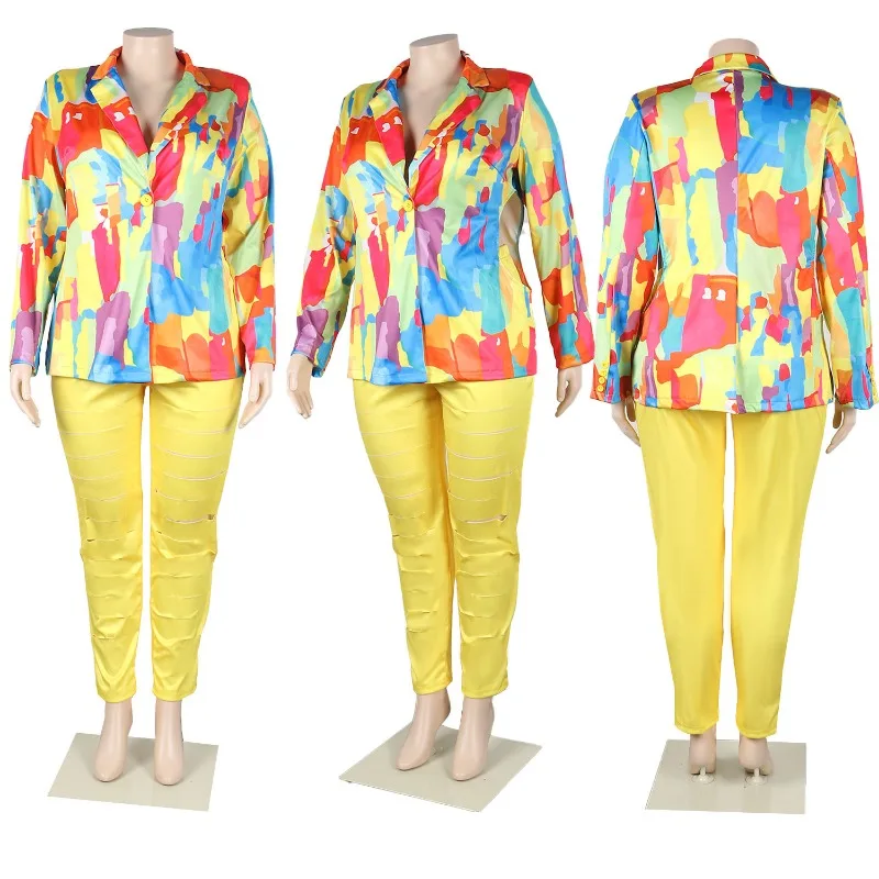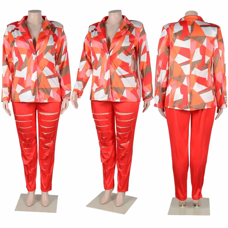 This Plus Size Print Blazer and Cutout Skinny Pencil Pants Set is perfect for any wardrobe. Crafted from high-quality fabric, this set is designed to last through frequent wear, while the blazer and cutout pants provide a comfortable fit for any body type. The unique print and the cutout detail on the pants give this set a fashionable touch.